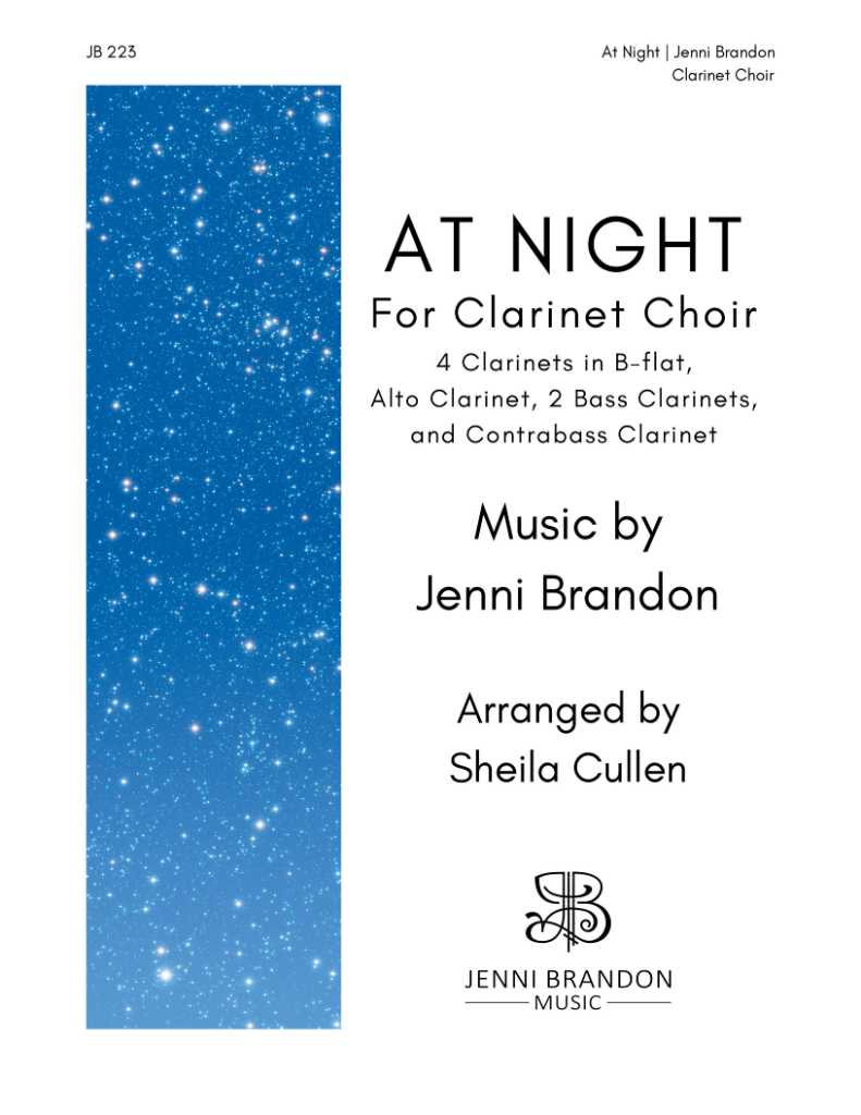 At Night for Clarinet Choir (4 Clarinets in B-flat, Alto Clarinet, 2 Bass Clarinets, Contrabass Clarinet) was originally written for SATB choir a cappella. The poem At Night by Amy Lowell used for inspiration in both speaks of the wind singing through the trees and the excitement of the wild wind. The clarinets imitate this idea of the wind at the beginning and end of the piece through freely played sections. Much of the piece contains this feeling of joyful freedom, from a dance-like section to the feeling “wild, tumultuous joy” that grows and builds with excitement. Towards the end of the piece when the clarinets come together to explore the feeling of the text “And my mind, O Star! is filled with your white light,” we feel the true wonder of a hot July night and the freedom to enjoy the onward sweeping wind.