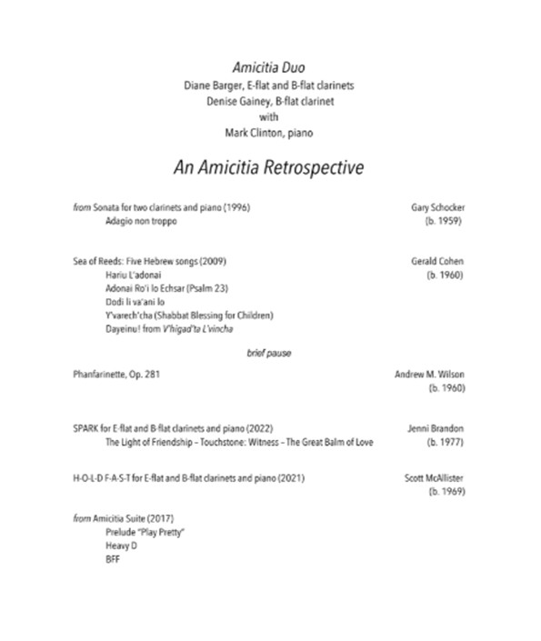 The Amicitia Clarinet Duo, at the Oklahoma University School of Music – Pitman Recital Hall, performed “Spark” by Jenni Brandon. This guest artist recital by the Amicitia Clarinet Duo was on Tuesday, April 1, 2025, from·6:00 – 7:00pm. The members of the Amicitia Duo are Diane Barger, Denise Gainey, and Mark Clinton.